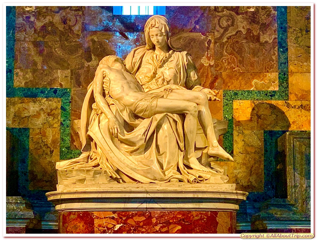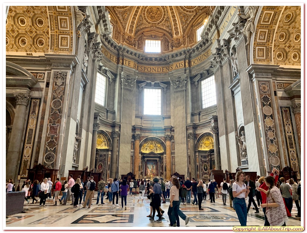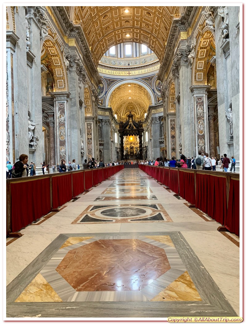 St. Peter's Basilica - One of the two most important places to visit. The magnificent 16th - 18th century-built basilica has a huge 185 meters long and 46 meters high nave with a 119-meter-high dome. The right side of the St. Peter's Basilica has the famous Michelangelo's Pieta (The Pity), which is still a prized sculpture, even though it's now guarded by a reinforced glass. The richly decorated Chapel of the Sacrament is also on the right of the basilica. Above the Papal altar, four massive pentagonal piers hold the Michelangelo's dome.